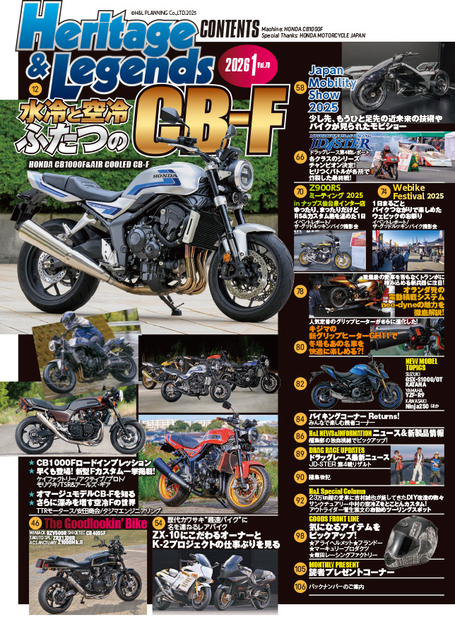 【11月29日(土)発売!】巻頭特集『水冷と空冷 ふたつのCB-F』=HONDA CB1000F&AIR COOLED CB-F=/『Japan Mobility Show 2025』=少し先と近未来が見られたモビショー=/『JD-STER 2025 Round.4レポート』=ヒリつくバトルが各所で炸裂の最終戦!=/『ZX-10にこだわるオーナーとK2プロジェクトの仕事ぶり』/『電動積載システムneo-dyneの魅力を徹底解説!』=愛車をトランポに積み込む新兵器!=/『ザ・グッドルッキンバイク撮影会』=Z900RSミーティングinナップス仙台泉インター店&Webike Festival 2025=…and more!