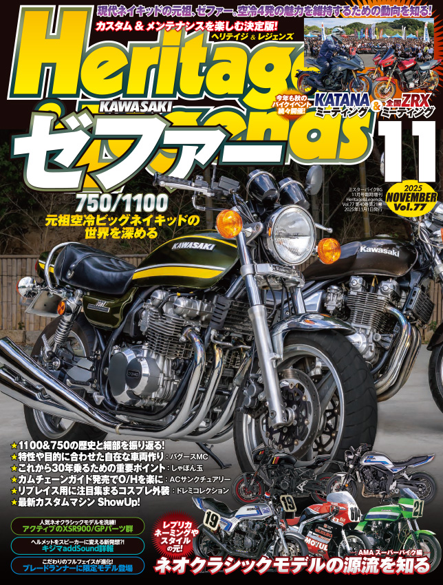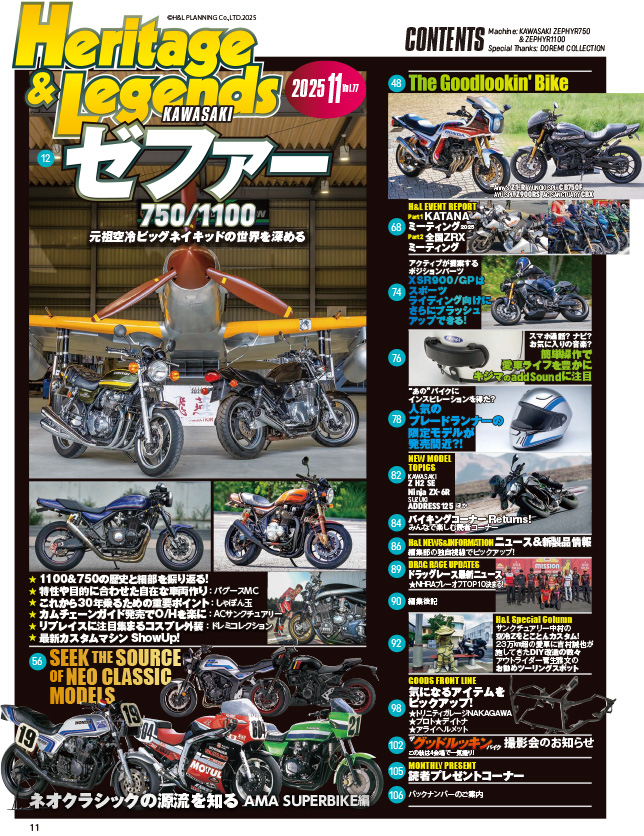【9月29日(月)発売!】巻頭特集『KAWASAKI ゼファー750/1100』=元祖空冷ビッグネイキッドの世界を深める=/『SEEK THE SOURCE OF NEO CLASSIC MODELS ネオクラシックモデルの源流を知る』=AMA SUPERBIKE編=/『H&L EVENT REPORT』=KATANAミーティング2025&全国ZRXミーティング=/『XSR900/GPをアクティブ製ポジションパーツでスポーツライディング向けにブラッシュアップ!』/『人気フルフェイス! ブレードランナーの限定モデルが発売間近?!』/『キジマのaddSoundに注目』/『ザ・グッドルッキンバイク』=編集部イチ推し! 最新カスタムバイク=…and more!