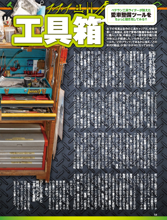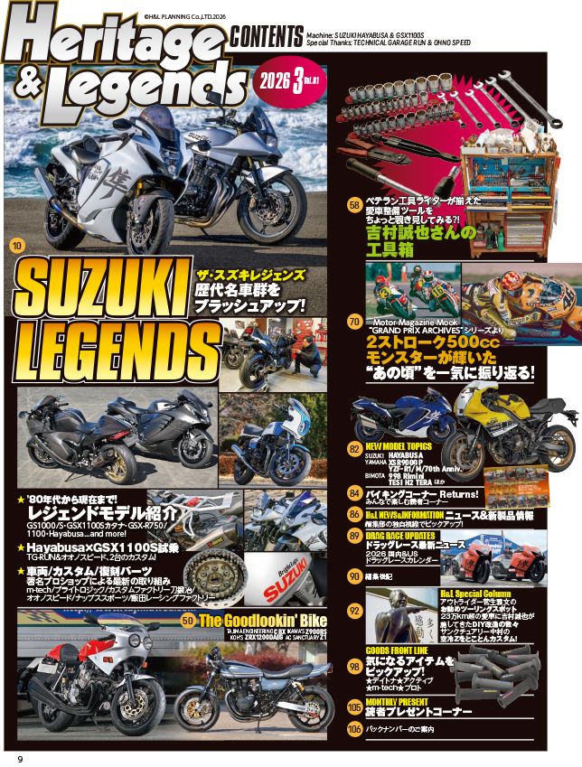 【1月29日(木)発売!】巻頭特集『ザ・スズキレジェンズ』=歴代名車群をブラッシュアップ!=/『吉村誠也さんの工具箱』=ベテラン工具ライターが揃えた愛車整備ツールをちょっと覗き見してみる?!=/『2ストローク500ccモンスターが輝いた“あの頃”を一気に振り返る!/『ザ・グッドルッキンバイク』=編集部イチ推しカスタム紹介=…and more!