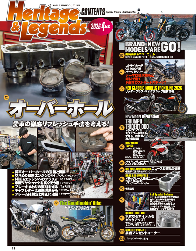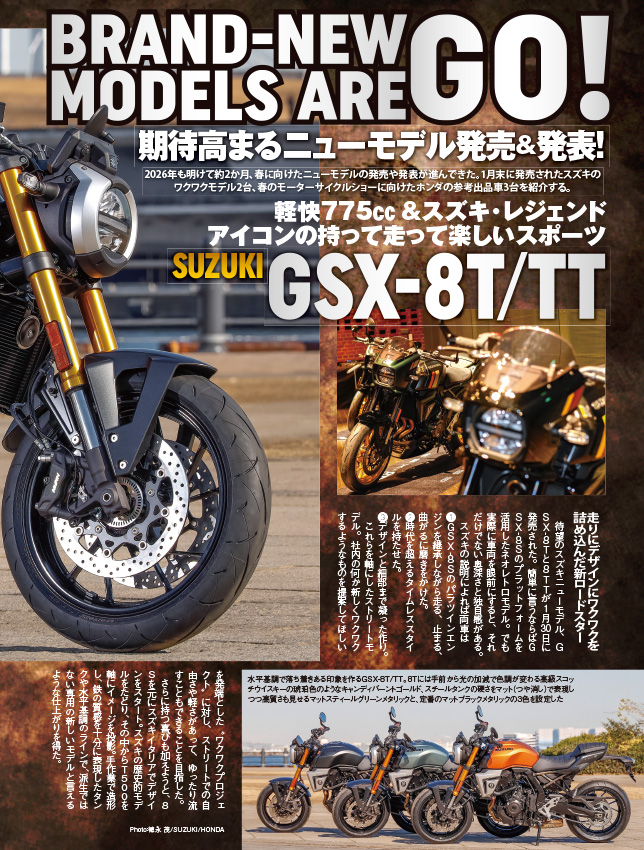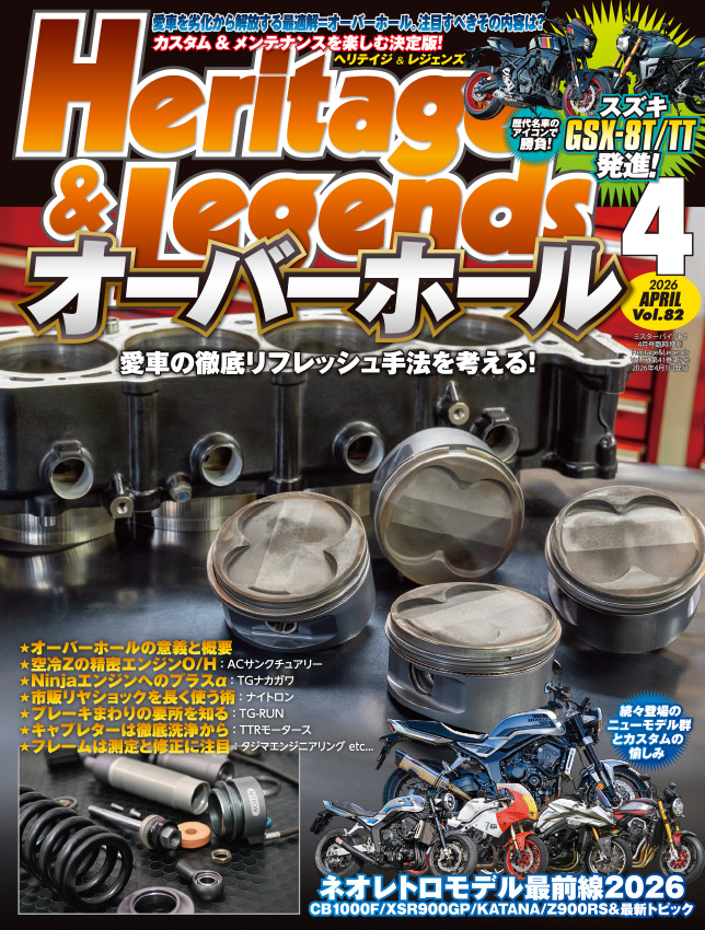 【2月28日(土)発売!】巻頭特集『オーバーホール』=愛車の徹底リフレッシュ手法を考える!=/『BRAND-NEW MODELS ARE GO! 期待高まるニューモデル』=GSX-8T/8TT、CB1000GTほか詳報=/『ストライカーがCB1000F用パーツをリリース!』=ド直球のストリートスポーツ!=/『NEO CLASSIC MODELS FRONTLINE 2026! リッタークラス・ネオクラシック最新情報』…and more!
