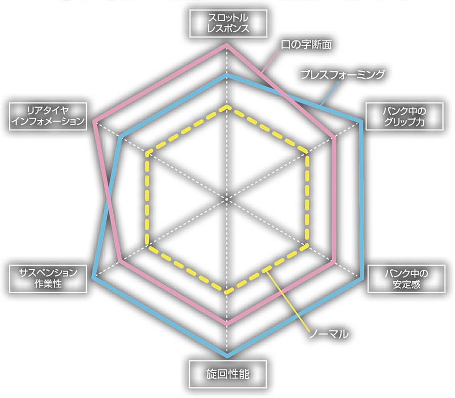 上はアクティブが製作した2品の違いを視覚化したレーダーチャート。下の表でお勧めシチュエーションと謳う通り、プレスフォーミングタイプの方がよりサーキットユースに適していることが分かる。ただ、これは製品の優劣ではなくユーザーが何を求めるか、で使い分けるのが適切だ。
