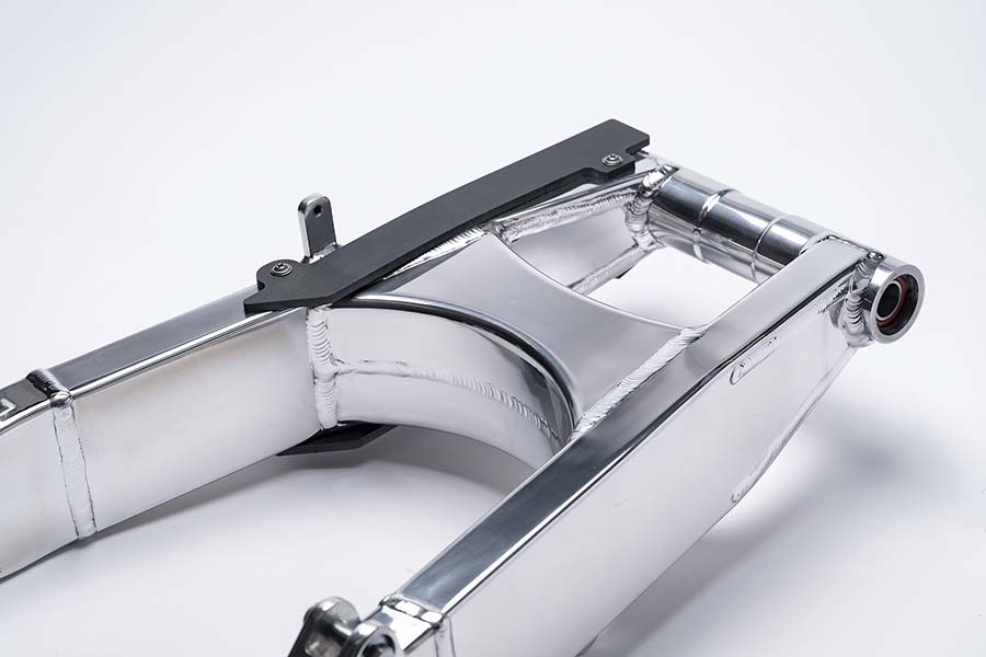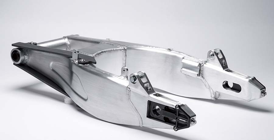 独特のデザインはスーパースポーツのスイングアームに準じていますが、それは剛性と柔軟性のバランスを追求した形状で、本体は7N01の板材を折り成形しながら、横方向の剛性を抜いてある程度のしなりを出し、一方の縦方向では長さ(高さ)を持たせ、ねじれに対する剛性をアップする。車種専用設計品で、進化するスポーツタイヤの性能をネイキッドバイクでも余すことなく使い切ることを目標としたものでした。