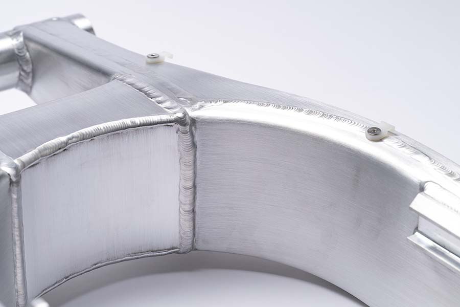 アーム本体の口の字構造と肉抜き軽量化されたエンドブロックが分かる。各部サイズの違いこそあれ、プレスフォーミングタイプも同様だ。こちらもプレスフォーミングタイプ同様の思想によるクロスパイプを装着、溶接後に同軸加工される高精度なピボット構造を筆頭とした精密組み立ても行われる。純正チェーンガード装着不可も同じだ。
