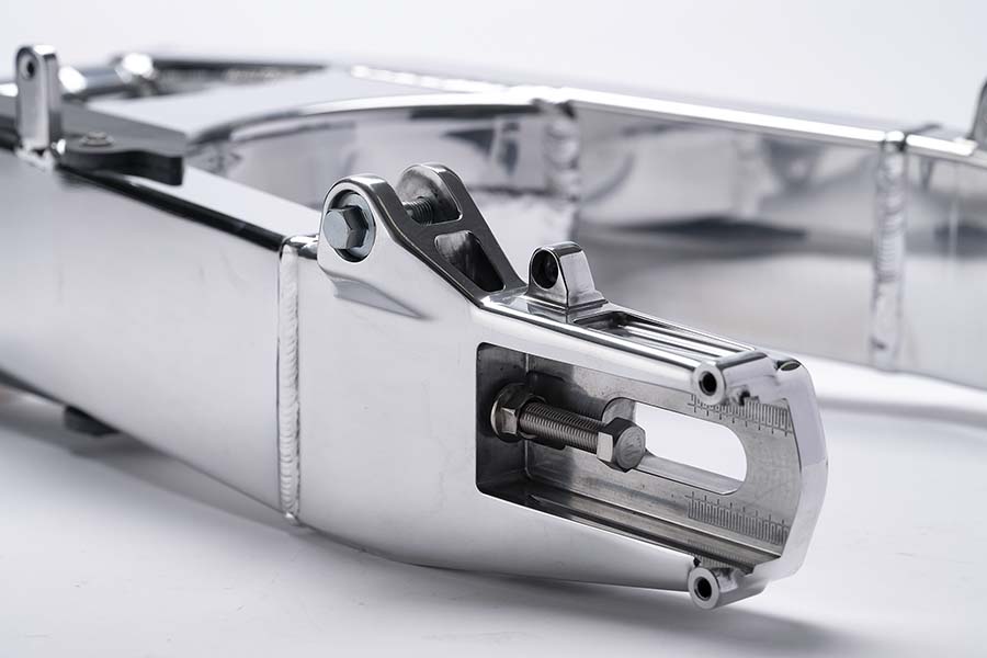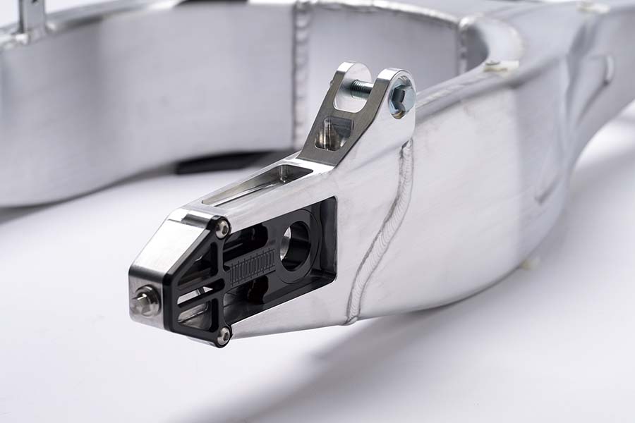 プレスフォーミングタイプのディテールで注目したいのが、アーム本体からなだらかな弧を描きつながるクロスパイプ。強度解析で得たデザインによるプレス成型部材で安定した挙動を生み、結果、加速時のトラクションを底上げできるという。7N01材削り出しのエンドブロックにはチェーンふたコマ分の伸縮ができるロングチェーンアジャストを採用。