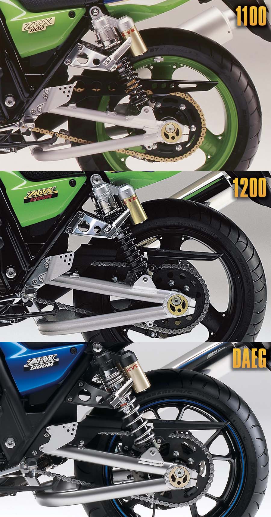 この機会に純正スイングアームの変遷もおさらい。1100は丸断面パイプ製で530mm長(ピボットセンター〜チェーンアジャスターセンター間、以下同)。1200では楕円断面材×540mm長で下側ショックマウントが15mm前進。エンド部内幅も10mm拡大した。DAEGはD字断面材×540mm長、下側マウントは1200比で20mm後退(1100比5mm後退)。上側は3車同じだ。
