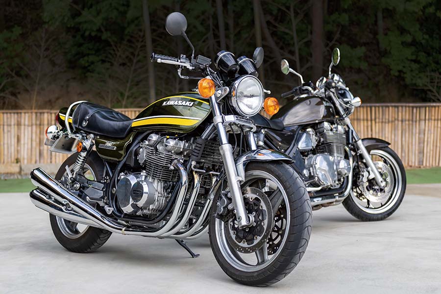 “Z2タイプスチールタンクセット(Z2キャップ仕様)黄タイガー”や“Z2タイプSTDシートASSY”、“Z2タイプ4本エキゾーストマフラー”でドレスアップされたゼファー750(手前)とSTDのゼファー1100(奥)。今やドレミの外装キットは、終売から約20年が経過し劣化したゼファーの外装を蘇らせるために必要不可欠なブランド・パーツになったのだ。