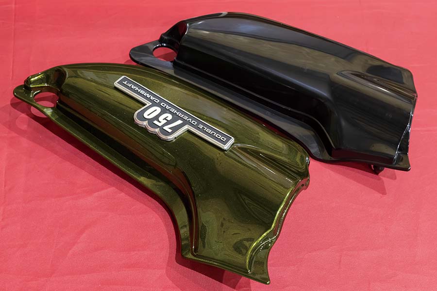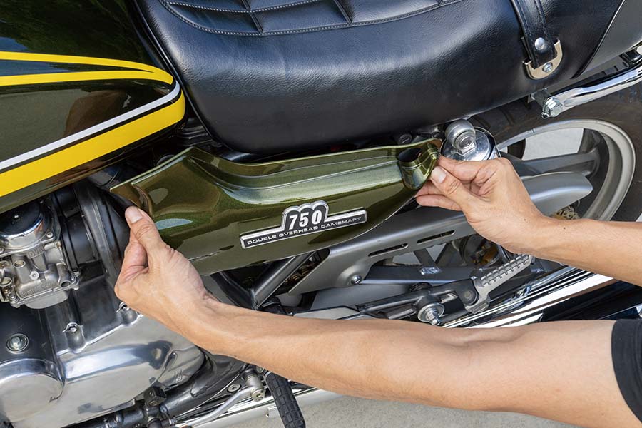 上写真はZ2タイプスチールタンク用で、中央写真に見る通り、黒ゲル仕様で見せる上の純正タンク用のZ2タイプサイドカバーとはタンク/シートに沿うラインが明らかに違うのが分かるだろう。加えて装着用ツメ位置も違うから正しいものを購入したい。