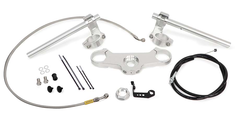 XSR900用セパレートハンドル&トップブリッジキットはセパハン化するも前傾姿勢になりすぎない、乗りやすいポジションを意識、装着に必要なホース類も付属する。