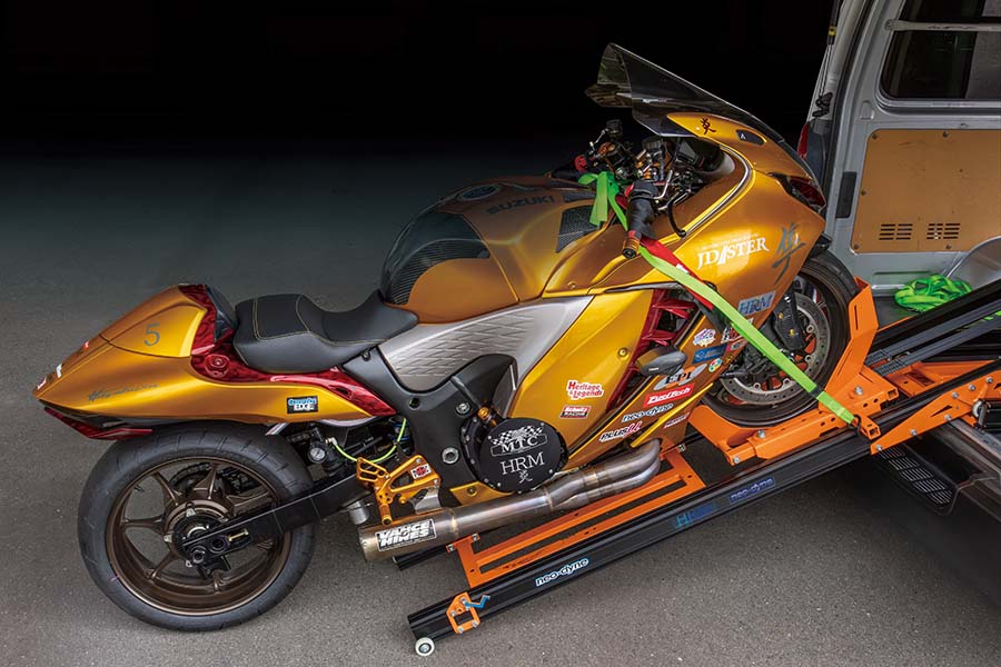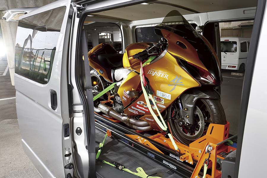 炎(ほむら)貴光さんが代表を務める、名古屋市にあるHRMは元々、大手企業が保有する製造ラインの保守点検や修理を担う企業でバイクとは無縁だった。炎さんがJD-STERドラッグレースへの参戦のためにトランポでマシンを運搬する際に、ロング&ローの車体を腹など擦らずクルマに積み込める便利な製品はないか、と探したところでneo-dyne(ネオダイン)に辿り着いたのが、販売スタートへと至るきっかけになったと言う。