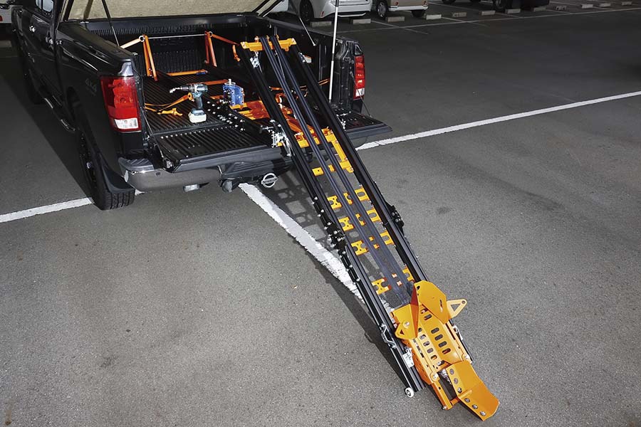 積載作業は以下に詳しいが、なるほどこれなら重量級のビッグバイクも軽々とトランポから積み下ろしできる。一般のラダーをトランポに渡してバイクを力任せに押し上げる必要もないし、転倒リスクもほぼ皆無に近いものとなる。