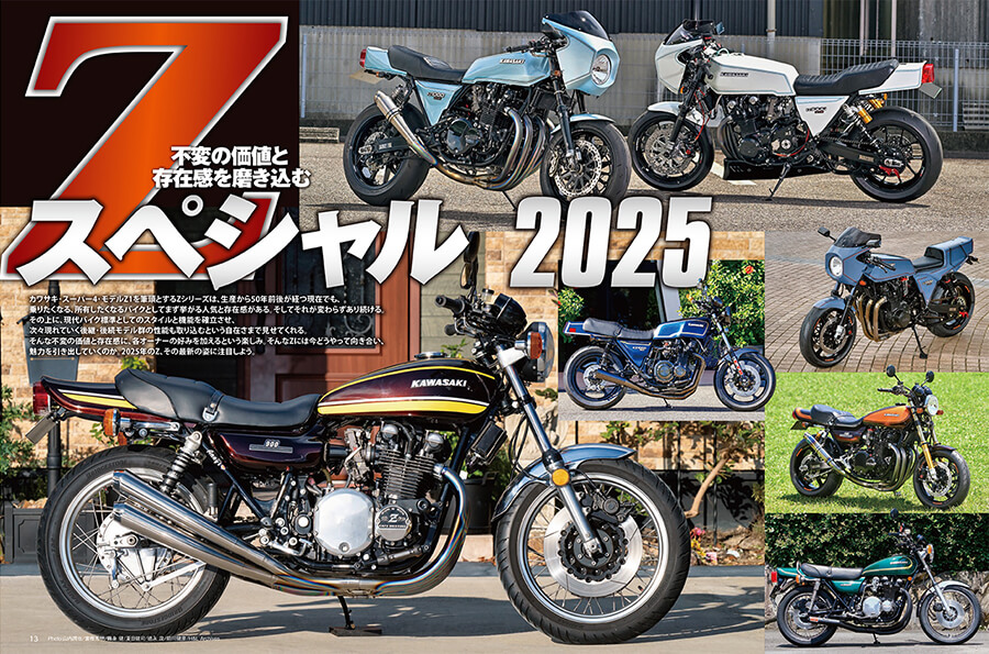 巻頭特集『Zスペシャル 2025』。稀代の名車、カワサキZシリーズ。その不変の価値と存在感に各オーナーの好みを加えて磨き込む、そんなカスタムの楽しみ方を軸に同シリーズの最新情報を全30ページの大型企画としてお届けします。