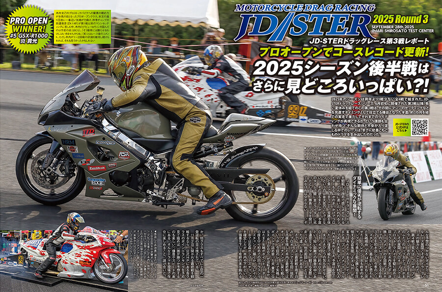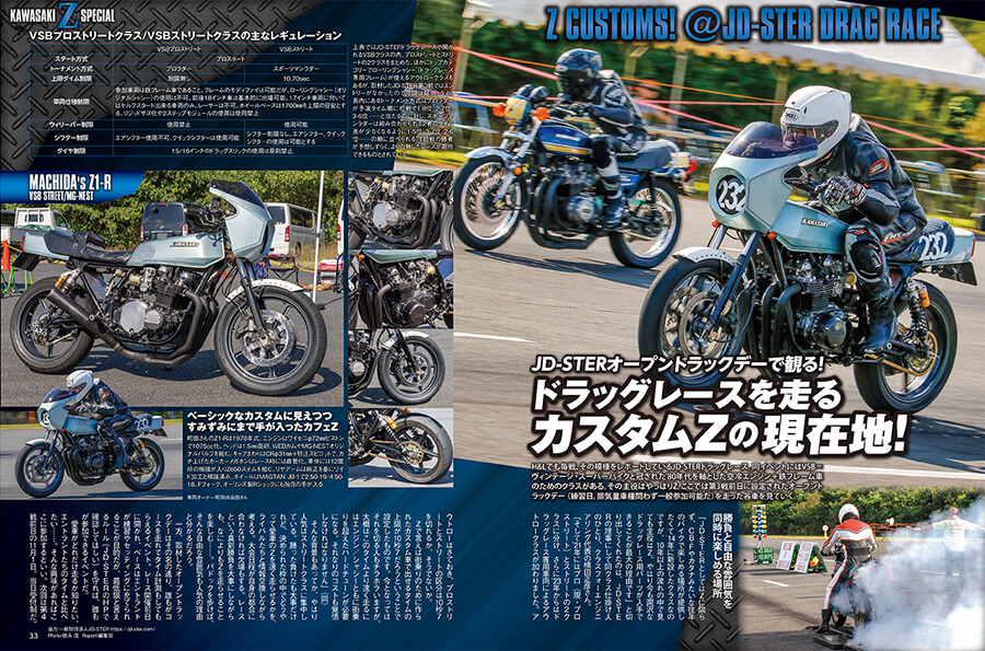 他では読めない少しオフセットした記事としては、あのJD-STERドラッグレースのVSB(ヴィンテージ・スーパーバイク)ストリート系クラスへの参戦車両も取材。1/4マイルをいかに速く走るか、をテーマに作られた各マシンの詳細もお届けします。