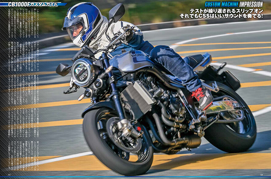 「ノーマルのエキゾーストパイプにスリップオンマフラーを組み合わせる、このCSSは4-2-1レイアウトになります。低回転のトルクをもっと出すためにも4-2-1はベストですが、CB1000Fはノーマルですでにこの回転域のトルクは十分。だからあえてトルク域を中〜高回転に振ってみたんです。もちろん、フルエキゾーストほど性能アップは際立たないけど、新しくオーナーになる人には、これくらいがいい雰囲気に感じると思うんですよ」