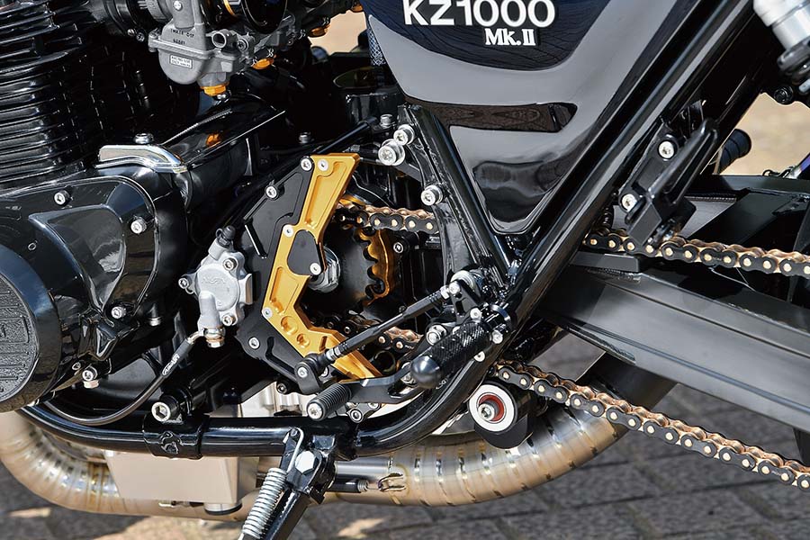 フロントスプロケットはオフセットタイプでなくフラットで、これはロングカウンターシャフトを使うドライブチェーンEVOシステムによる。スプロケット奥に見える金色のパーツはEVOミッションカバーの一部で、カウンターシャフトの支持幅を広く取りミッションへの悪影響を抑え、スムーズな回転を得る。ドライブチェーンはEK530RCMのBK;GP(ブラック×ブラック)だ。