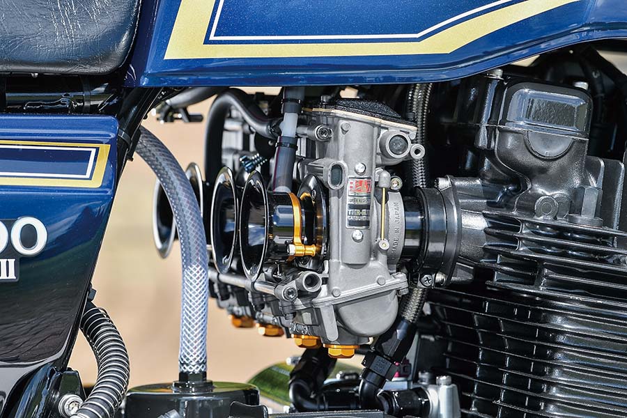 キャブレターはヨシムラ・ミクニTMR-MJNφ38mmをヨシムラデュアルスタックファンネル仕様で組みこんだ。