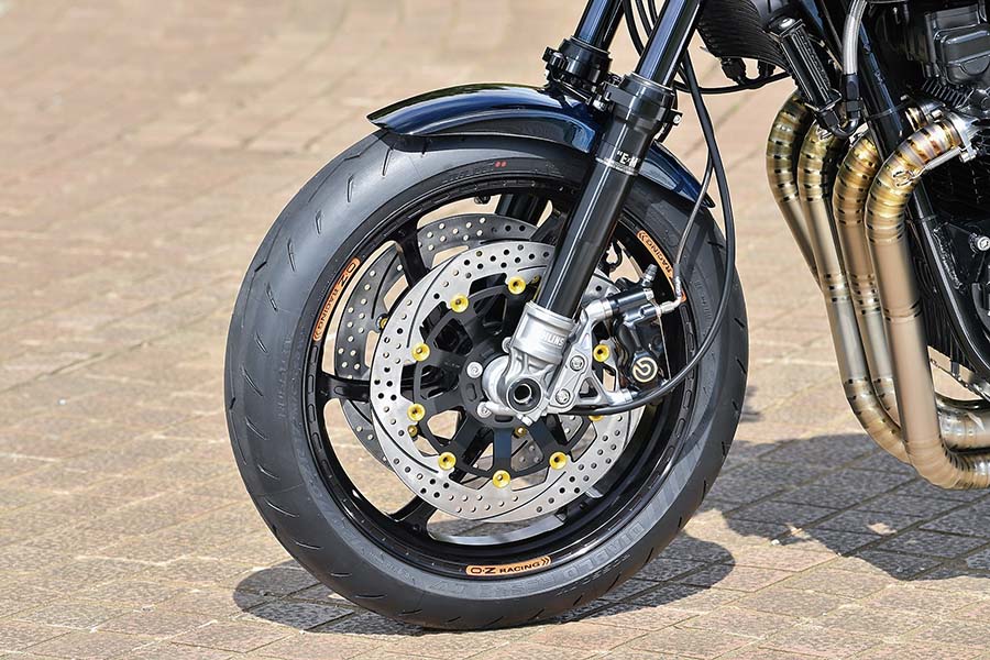 ノーブレストE×MパッケージによってオーリンズRWUフォークを組み、フロントブレーキはブレンボ484 cafe racerキャリパー+サンスター・プレミアムレーシングディスクの構成。