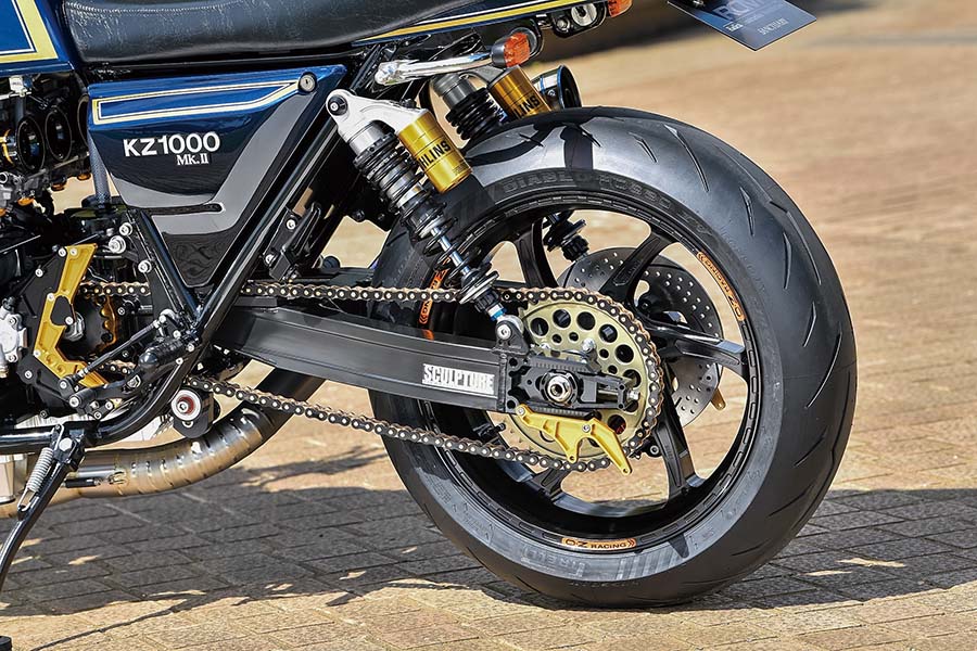 リヤサスはオーリンズ・レジェンド・ツイン(KA132)にスカルプチャーR.C.M専用ワイドスイングアームを組み合わせる。アルミ鍛造のホイールはO・Zレーシング・GASS RS-Aでサイズは3.50-17/5.50-17。