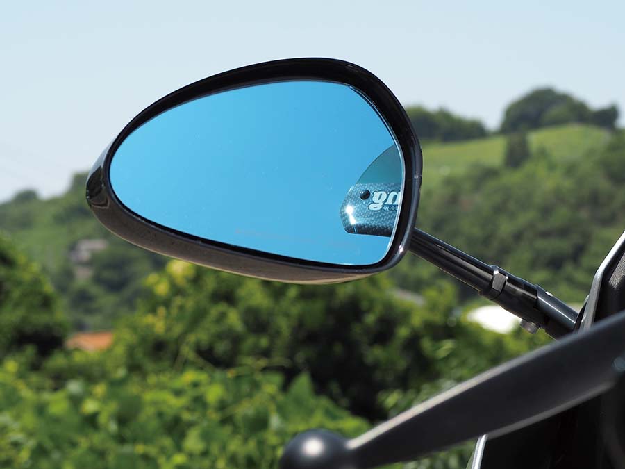 レーサーレプリカミラーにはクリアで後方視界に優れた高品質の「ブルーミラー」が採用されている。純正ミラーよりも上下左右の視界が広く、歪みも最小限に抑えられている。