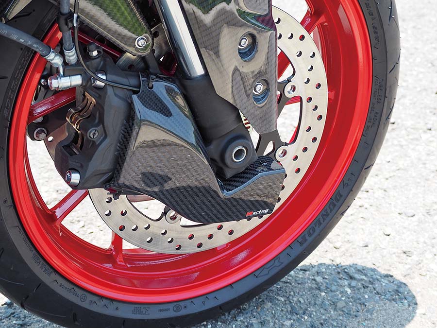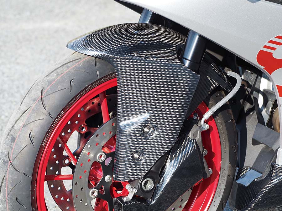 オイルキャッチ構造のアンダーカウルトレイに、中空モノコック構造によってコーナリング時にもライダーの下半身のホールド性を高めるタンクエンド、またカーボンを立体成型して他にないシャープ感を持たせるフェンダーレスキットと、パーツ群はほぼ全身に用意される。その全部入りでもゴテゴテ感や違和感を感じさせないのもひとつの特徴かもしれない。