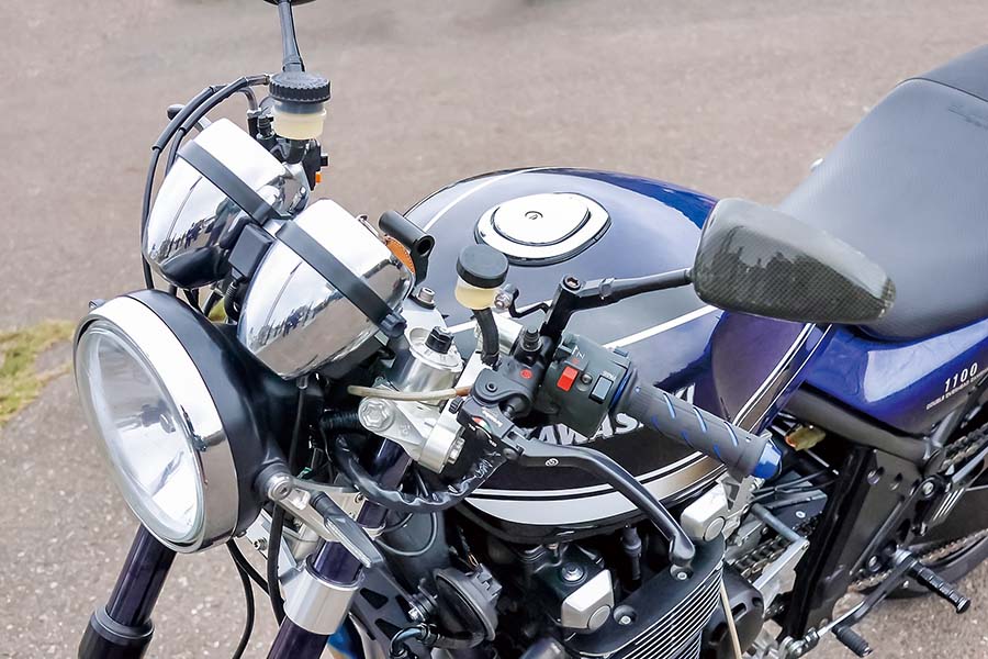 大きめのヘッドライトはキングダム。ステムはアグラスのトップ&ステムセットでトップブリッジ下にギルズツーリング・セパレートハンドルをマウントし、左右マスターはブレンボRCSをだ。