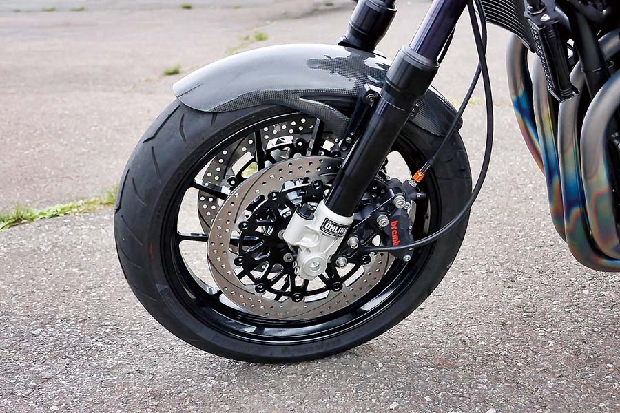 フロントフォークはオーリンズ正立でフロントブレーキはブレンボP4-40Cアキシャルキャリパーにサンスター・プレミアムレーシングディスクをセットする。