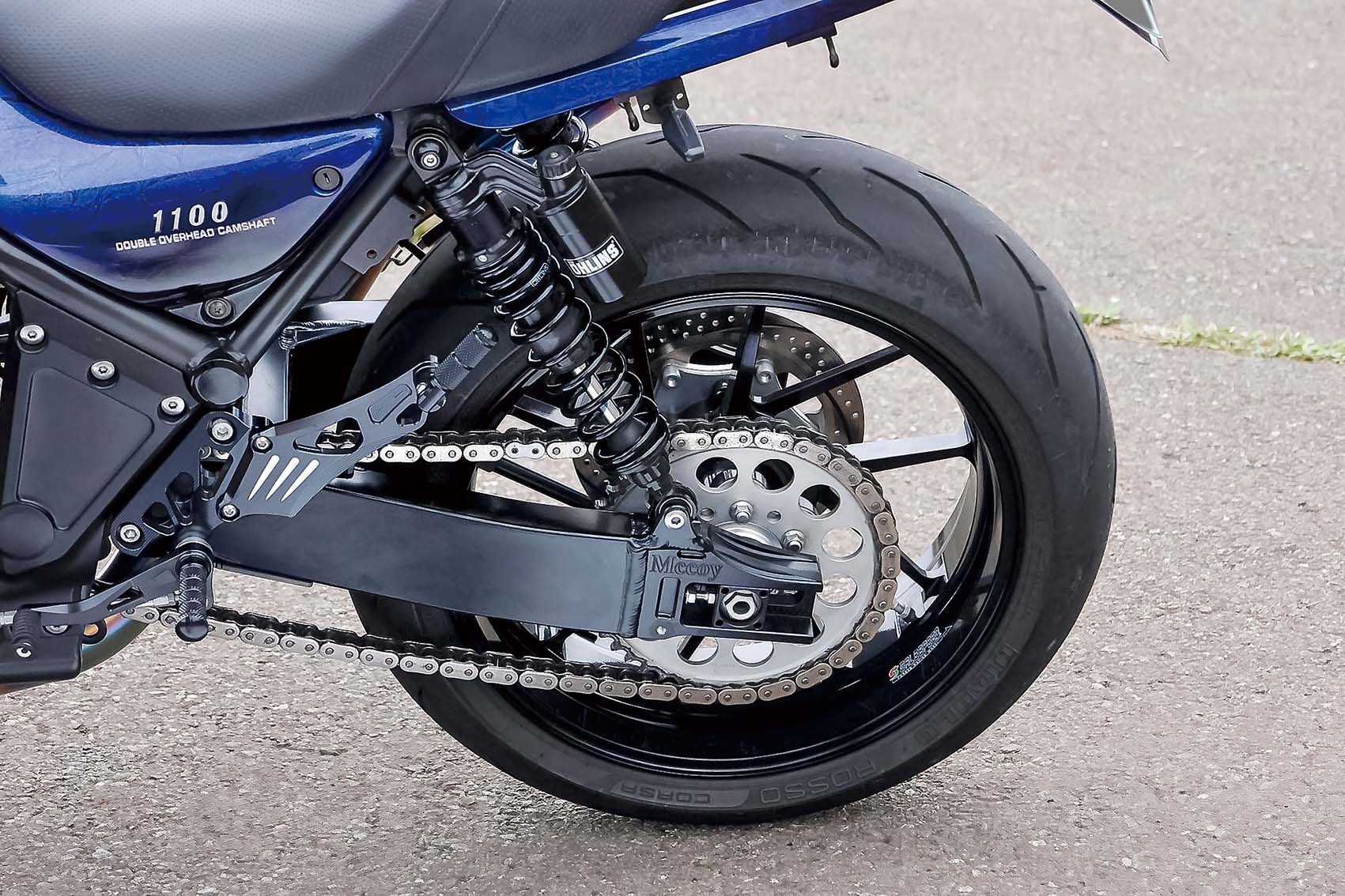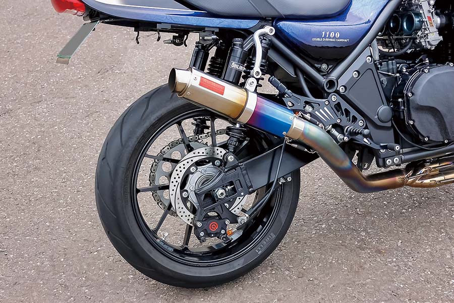 リヤサスはマッコイスイングアームにオーリンズ・ブラックライン(KA965)の組み合わせ。前後ホイールはアルミ鍛造のゲイルスピードType-Rでサイズは3.50-17/6.00-17だ。