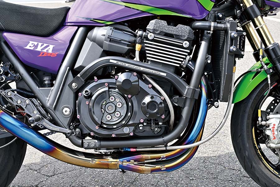 エンジンは内部ノーマルで、CTS製ZX ドライクラッチキット+スリッパークラッチKIT VERTEXを合わせてセット。マウント用64チタンボルトも紫にしている。