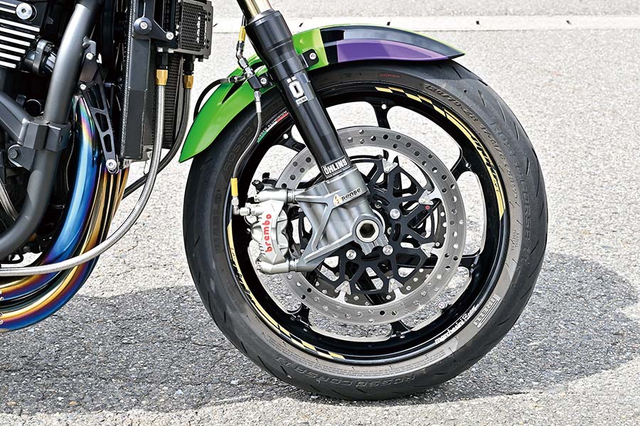 フロントフォークはオーリンズRWUでボトムにG Fork ラジアルマウントフォークボトムKitを組んでブレンボGP4-RSモノブロックキャリパーをブレンボTドライブディスクとともにセットする。