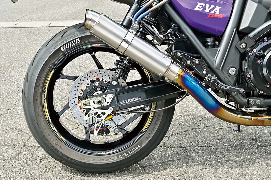ホイールはマルケジーニM7RS Genesiで3.50-17/6.00-17サイズ。当然ながらD.I.D×EVA RACING コラボドライブチェーン/520EVA-01が使われる。