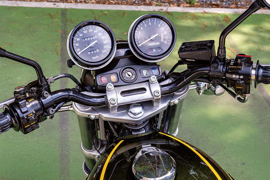 Z2タイプハンドルスイッチ(1万5400円)もドレミオリジナル。メーターはゼファー750純正のままだ。