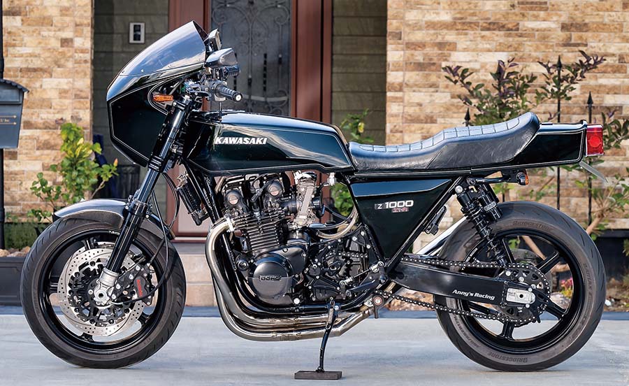 KZ1000を元にスリムな燃料タンクなど角型デザインの外装やビキニカウル、4-1メガホンマフラーを装着し、前後18インチで’77年にリリースされた“メイクス・カフェ”(メーカー製カフェレーサーモデルのこと。実際にもこう呼ばれた)Z1-R。そのスマートな印象をそのままに、現代的に洗練したと思えるこの車両。アニーズによる手が入っている。