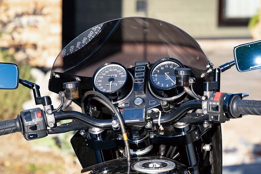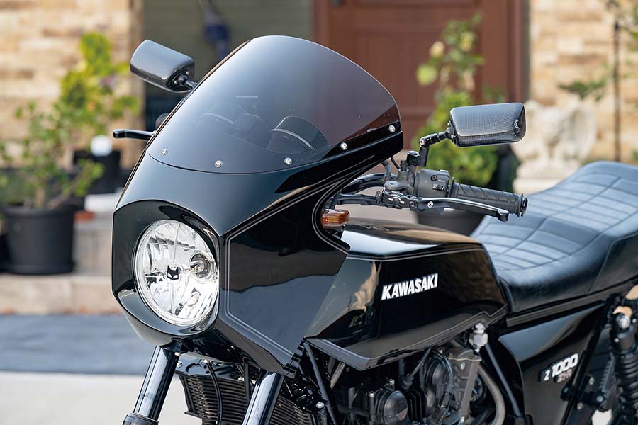 Z1-Rのすっきりしたスタイルを強調するような仕立て。アメリカンドリームPRIDEステムに低めのバーハンドルをセットし左右マスターはブレンボRCS、ミラーにはマジカルレーシングNK-1ミラー・タイプ3ヘッドをセットした。