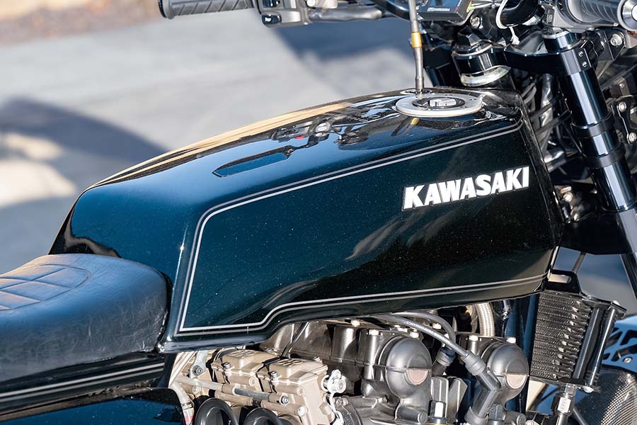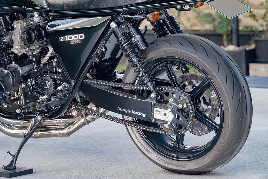 KZ1000を元にスリムな燃料タンクなど角型デザインの外装やビキニカウル、4-1メガホンマフラーを装着し、前後18インチで’77年にリリースされた“メイクス・カフェ”(メーカー製カフェレーサーモデルのこと。実際にもこう呼ばれた)Z1-R。そのスマートな印象をそのままに、現代的に洗練したと思えるこの車両。アニーズによる手が入っている。