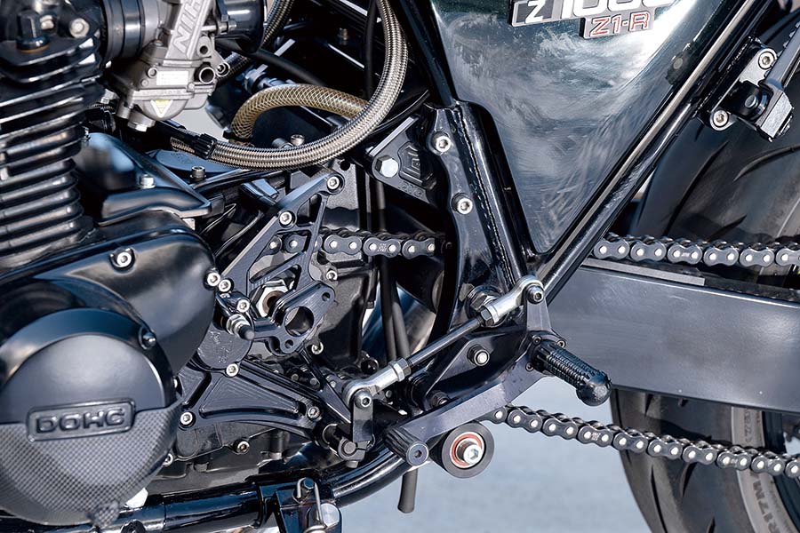 シンプルなステップはスピードショップイトウ・Z用ステップキット(アルミ削り出しバータイプ)。油圧式に換装したクラッチのレリーズはウイリーのZ1/2/MK-II用油圧クラッチシリンダー(TYPE-III)で、ドライブチェーンにはD.I.Dの525ZVMXを選択。