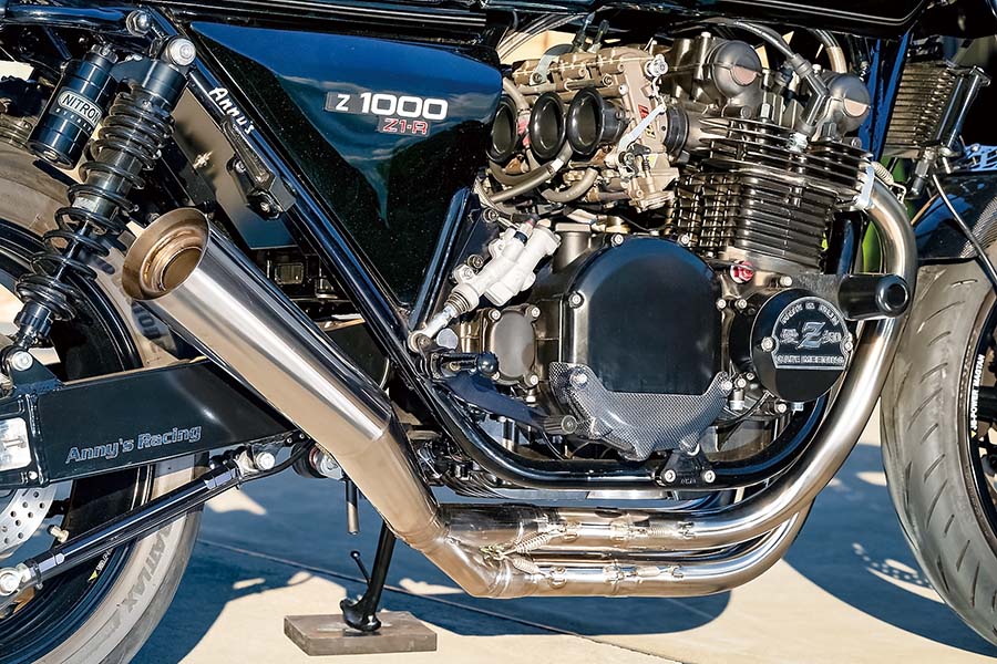 排気系はブルーサンダース・メガフォンタイプの別注チタンを使い、全体のルックスに合わせるとともに軽さも獲得。カーボンのクラッチカバーはアニーズのZ系 レーシングエンジンカバー:クラッチカバーだ。