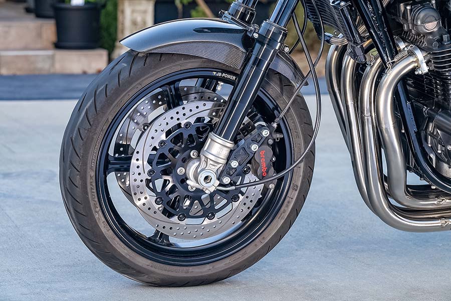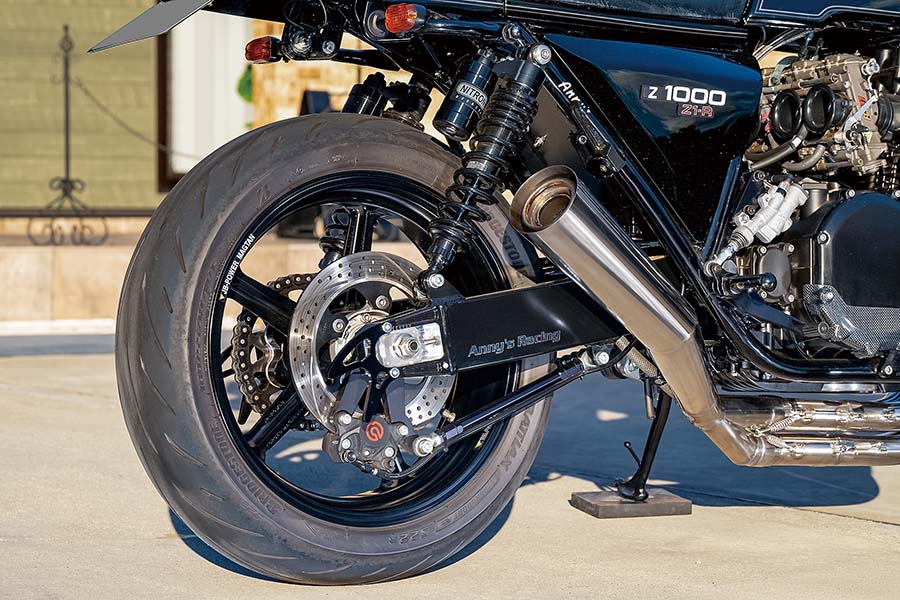 フロントフォークはオーリンズRWU、フロントブレーキはブレンボP4-40Cアキシャルキャリパーにサンスター・プレミアムレーシングディスク。ホイールはMAGTAN JB1で、17インチの設定が基本的にないがアニーズで特注した3.50-17/5.50-17サイズを履き、これもルックスをしっかりまとめてくれた。