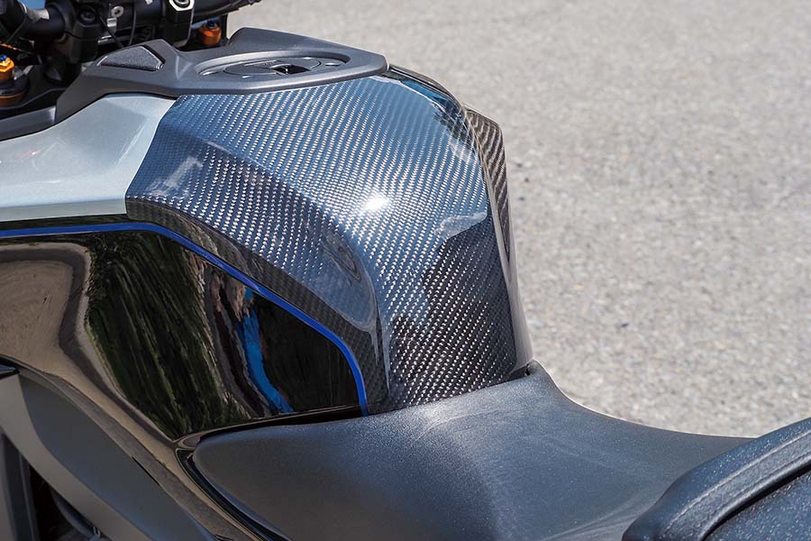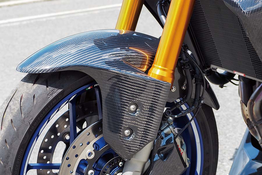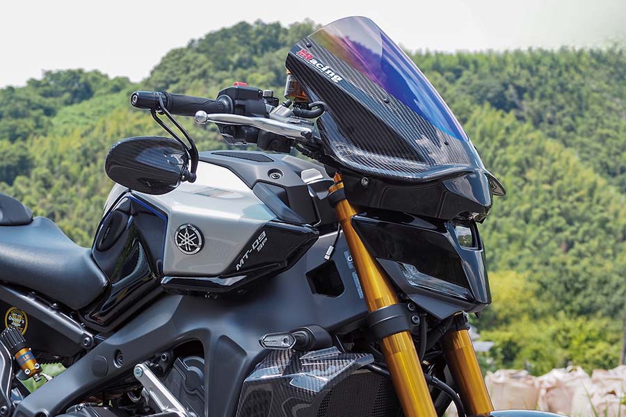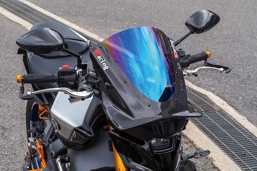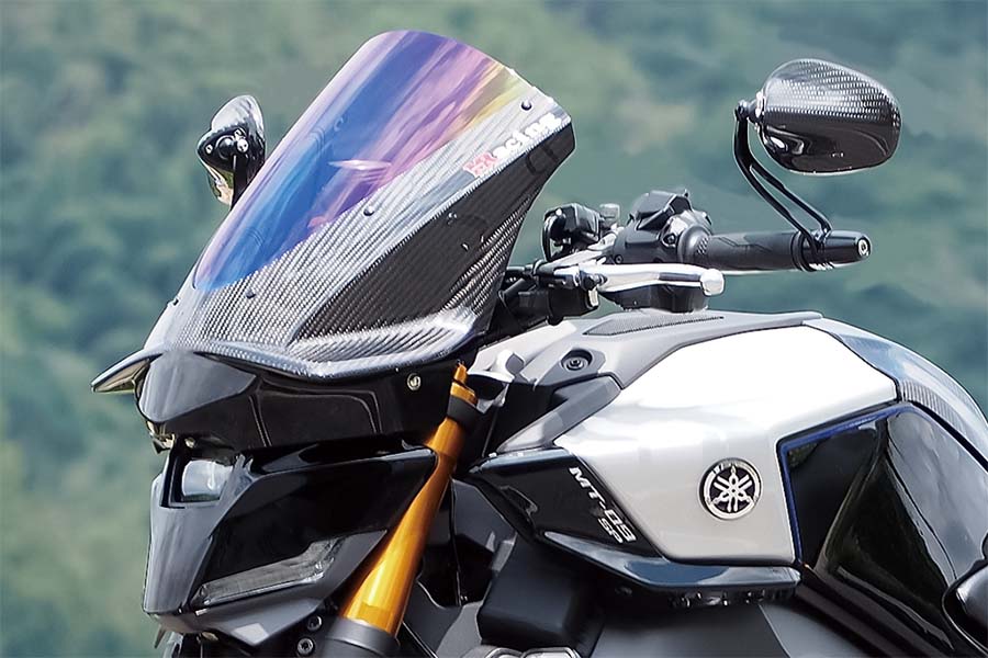 加えて、このMT-09/SPでは純正にない機能パーツがもうひとつ加えられている。バイザースクリーンだ。カウルやスクリーンのないネイキッドとしてしか選択肢のないMT-09/SPに高いエアプロテクション性能を加えることができ、スクリーンもデモ車で装着されるスーパーコート、スモーク、クリアが選べる。ウイングレット調のスポイラーなどの造形からくる車両全体の一体感は純正と言われてもおかしくないほどで、これはお勧めと言える。