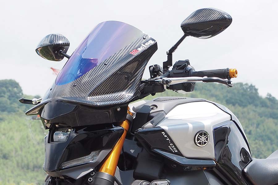 MT-09/SPのフロントにアクセントと防風効果を与えながら一体感の高いバイザースクリーン(写真は綾織りカーボン製[一部FRP黒]/スーパーコートスクリーン。以下各パーツは綾織りカーボン製を装着)は6万6000円〜8万7400円。1カ所の基部から2本のステーを伸ばす(TYPE B[M8タイプ])バーエンドミラー(TYPE7ヘッド)は6万4900円〜6万7100円。ステーはブラック、シルバーあり、ハンドル上側/下側マウント可能でこれは上側への装着状態だ。