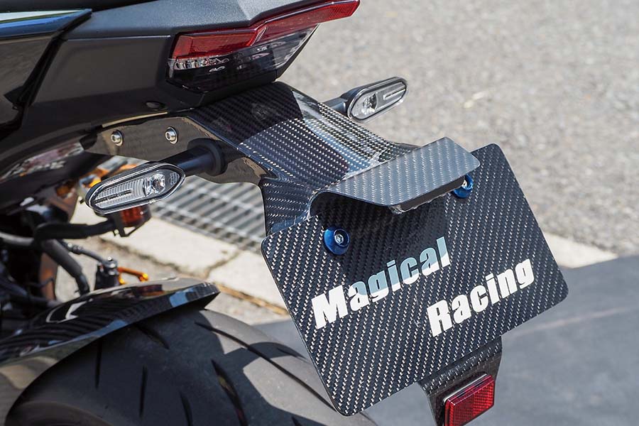 マジカルレーシングが多くのスポーツモデルに展開する“ストリートボディワークシリーズ”。綾織りまたは平織りの自社製造カーボン製(一部FRP製もあり)パーツだ。フロントフェンダーやリヤフェンダーなど、その多くは純正に置き換えて質感を高める。あるいはリヤフェンダーのように泥跳ね・水跳ねを軽減したりする。