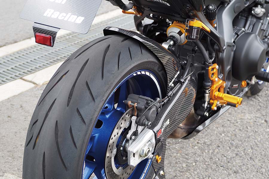 そこでこの車両だ。ヤマハMT-09 SPの現行、’24年型。マジカルレーシングのデモ車として、同社が展開するMT-09/SPストリートボディワークパーツのほとんどがセットされている。フロントフェンダーにリアフェンダー、スイングアームカバー。ラジエーターシュラウドにフェンダーレスキット。