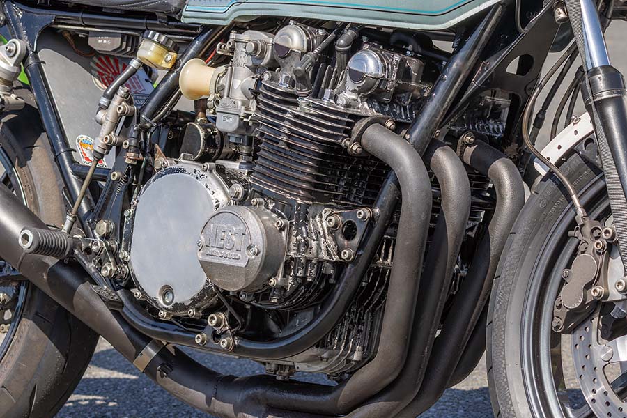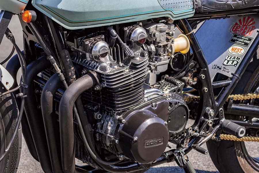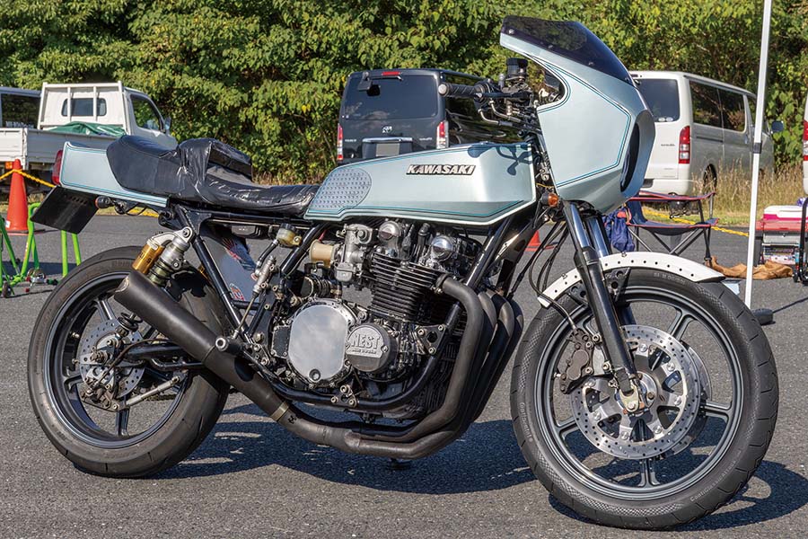 1978年式をベースとしてMG-NESTで手を入れ、エンジンはワイセコφ72mmピストンで1015から1075ccに排気量を拡大。シリンダーヘッドは1.5mm面研し、WEBカムやMG-NESTオリジナルバルブ/KPMバルブスプリングを組んでヘッドガスケットにHBR、ベースガスケットにBITO R&D製を組むなど、MG-NESTで実績ある手法を投入。吸排気系はCRφ31mmキャブレターに内径をストレートで取った特注スピゴットに、カチ上げでカーカーメガホンマフラーをセット。これはレース時には直管化して使う。車体面ではフレームに12カ所の補強を入れ、ステムにZ650純正を組んでフォークオフセットを純正60から50mmに変更。ホイールは純正の前後2.15-18から2.50-19/4.50-18サイズとしたMAGTAN JB1で、スイングアームは純正を元にワイド加工と補強を行うといった具合。前後サスにも独自の手が入り、ドラッグレース時に撮影したという分とは別に、純正スタイルをキープしながら“ああ、こうするときっちり走れるなあ”という仕様を各所に盛り込んでいる点が特徴と言える。