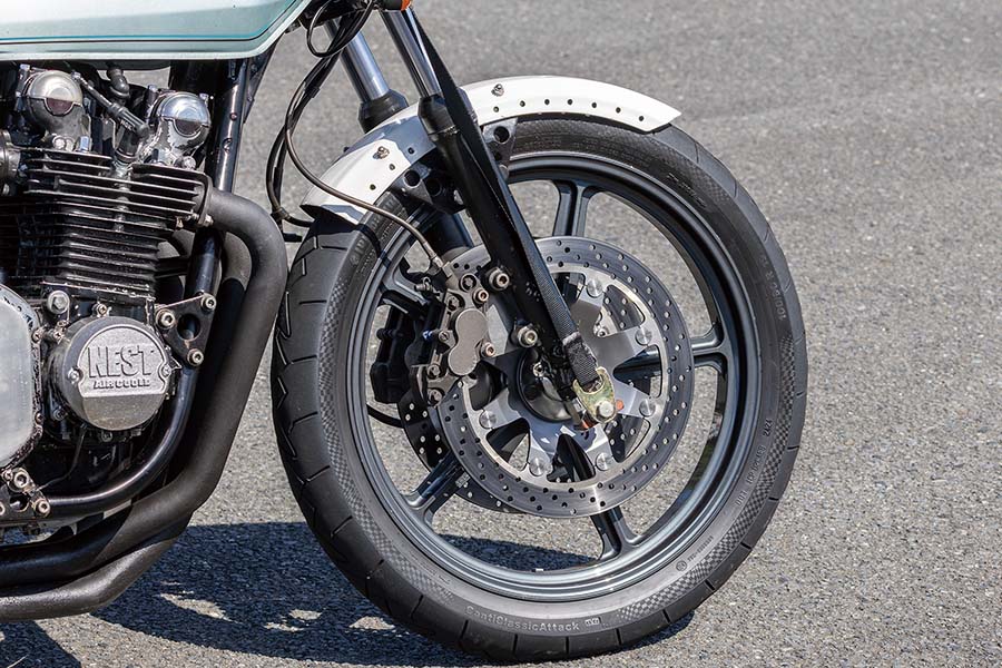 ホイールは前後2.15-18から2.50-19/4.50-18サイズとしたMAGTAN JB1をセット。φ36mmの純正フロントフォークは内部オリフィス加工を加えている。フロントキャリパーはNSR250R純正でディスクはサンスター・NEOクラシックφ320を使う。