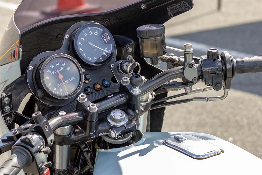 ステムにZ650純正を組んでフォークオフセットを純正60から50mmに変更した上で、ホイールを前後18から前19/後ろ18のマグネシウム鍛造品に換える。これで直進安定性と軽快性を両立しているようだ。メーターはパネルを起こした上でスタックST200クラブマンタコメーターと、GSX-R400純正速度計を組んでいる。フロントマスターはブレンボ・ラジアルだ。