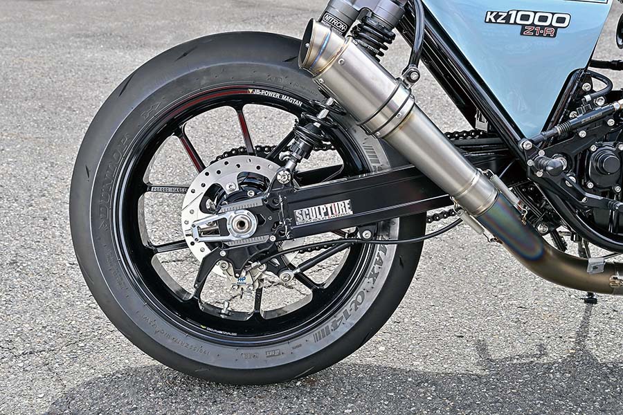 リヤブレーキはAPレーシングCP4226キャリパーにプラスミューディスク。MAGTAN JB3をセレクトしたホイールは3.50-17/6.25-17サイズで、リヤは現状では190/55ZR17を履いているが、いずれ200幅タイヤを履くための選定をしていた。