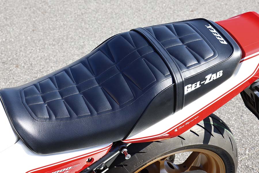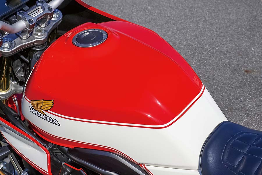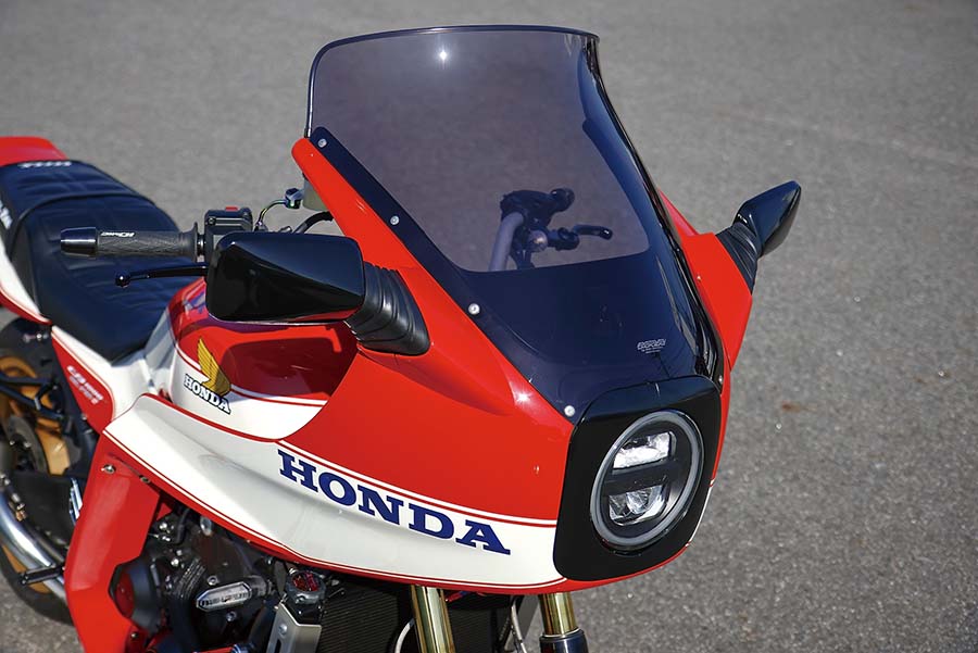 これはかつて国内でカウルの純正装着が認可された直後の’82年8月に現れたCB750Fインテグラ(’82年型CB750F2C)のカウルを加工しての装着。インテグラ同様にカウル下につながるレッグシールドもCB1000Fに合わせて加工、ヘッドライトは当時のものでなく、CB1000F純正のLEDを移植したという作り。全体のカラーは’81年にボルドール24時間耐久レース優勝を記念して登場した限定販売車、CB750FBB/F2BBボルドール2の勝利のイメージをまとわせている。
