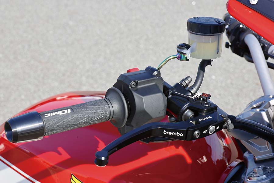 フロントマスターシリンダーはブレンボRCSコルサコルタRRでハンドルはEFFEXイージーフィットバーPlus、クラッチは同スムースフィットレバー クラッチをセットする。