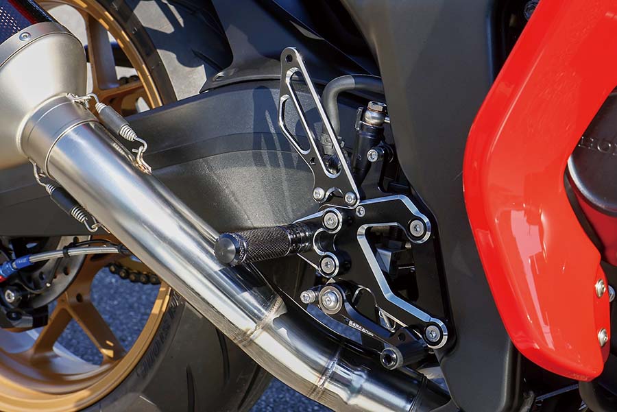 RCSコルサコルタ・フロントマスター以下ブレーキ系はブラックのcafe racerキャリパー/GP2-CRキャリパーにフロントのTドライブディスクとブレンボでまとめ、排気系もアクラポヴィッチ・スリップオンライン カーボンと、空冷CB-F純正ライクな雰囲気を細部にまで作りつつ、機能は的確に向上している。ベビーフェイス・ヘルメットロックにレーシングフックもそんなライダーサポートのひとつと言っていい。