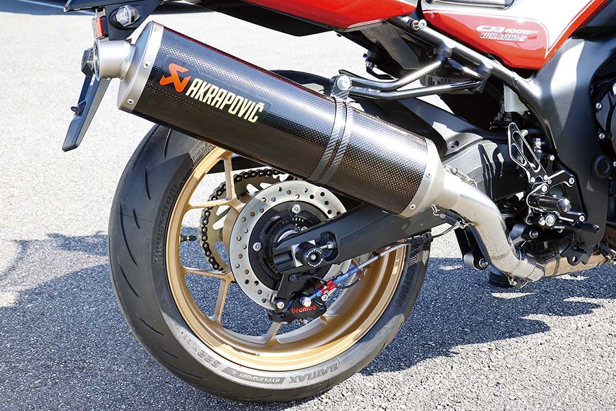 排気系はアクラポヴィッチ・スリップオンライン カーボンでプロト製マフラーハンガーとともに参考出品だ。