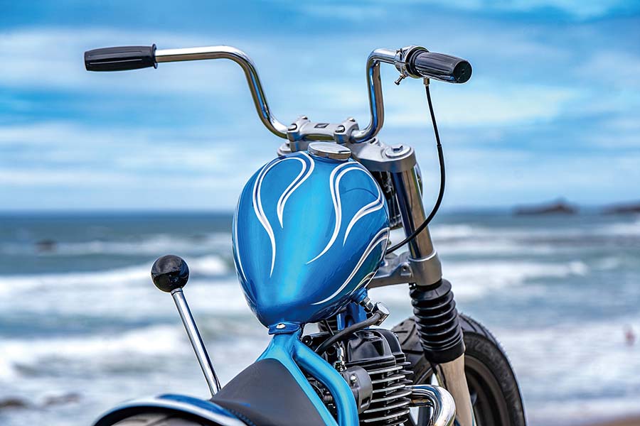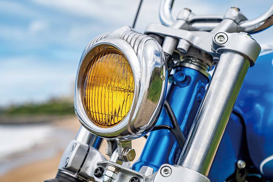 いわゆるピーナッツタンクを配して大アップのハンドル左右からはレバーさえも除き、究極ミニマルとも言える作り。クラッチはフット作動(足踏みクラッチ)でギヤチェンジは写真左に見えるノブを左手で操作するジョッキーシフトだ。