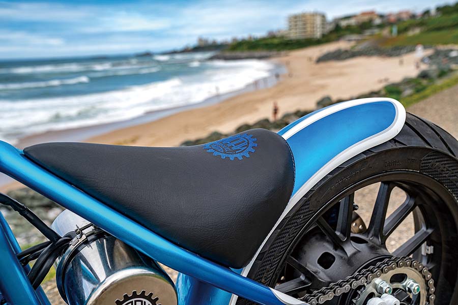 シートは一人乗り用を新作しリヤショックの見えないリヤはハードテイル(リジッド)を特注製作している。